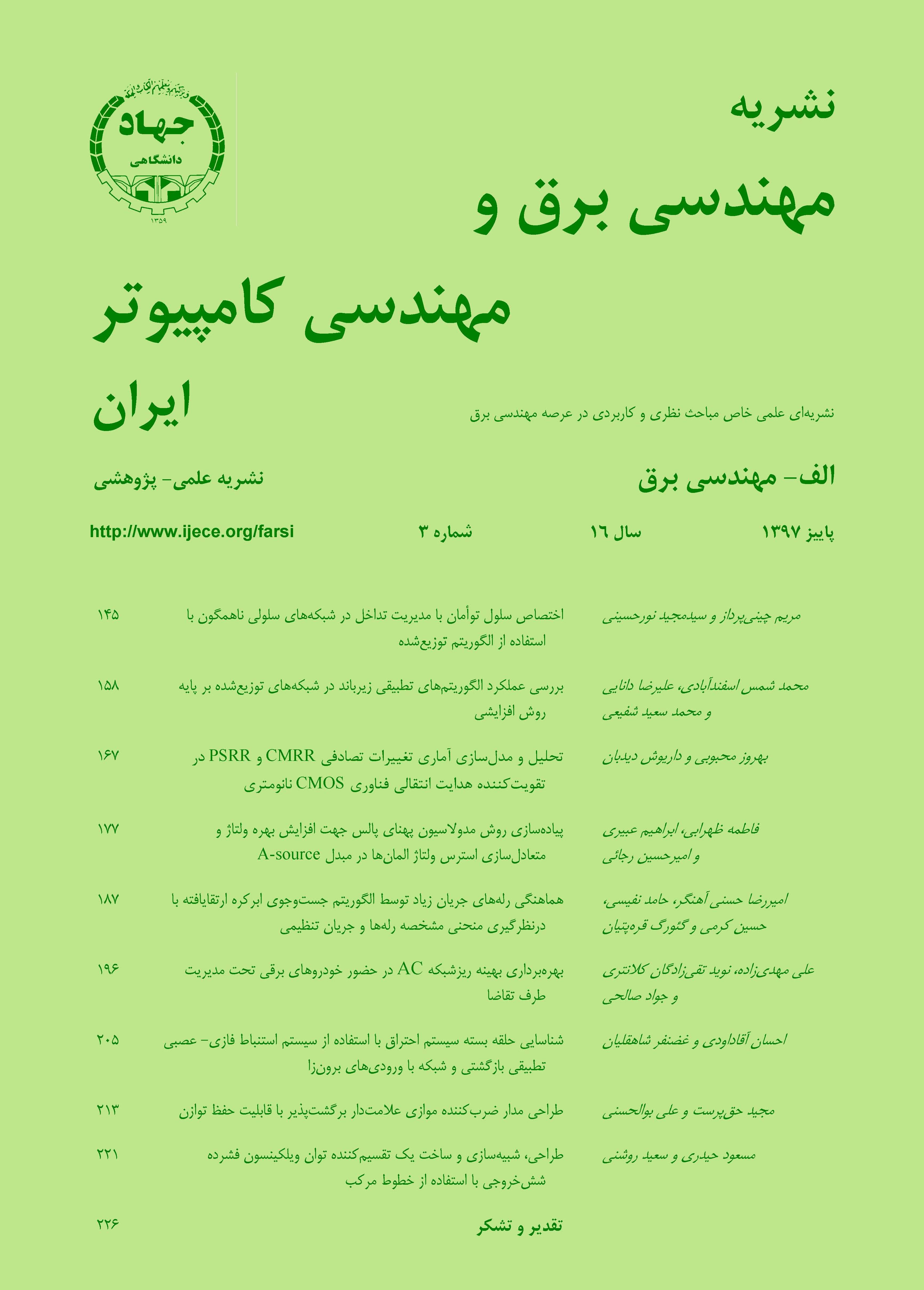 فهرست مقالات دسترسی آزاد مقاله صفحه چکیده متن کامل 1 - اختصاص سلول توأمان با مدیریت تداخل در شبکههای سلولی ناهمگون با استفاده از الگوریتم توزیعشده مریم چینیپرداز سید مجید نورحسینی 20.1001.1.16823745.1397.16.3.1.1 دسترسی آزاد مقاله صفحه چکیده متن کامل 2 - بررسی عملکرد الگوریتمهای تطبیقی زیرباند در شبکههای توزیعشده بر پایه روش افزایشی محمد شمس اسفند آبادی علیرضا دانایی محمدسعید شفیعی 20.1001.1.16823745.1397.16.3.2.2 دسترسی آزاد مقاله صفحه چکیده متن کامل 3 - تحلیل و مدلسازی آماری تغییرات تصادفی CMRR و PSRR در تقویتکننده هدایت انتقالی فناوری CMOS نانومتری بهروز محبوبی داریوش دیدبان 20.1001.1.16823745.1397.16.3.3.3 دسترسی آزاد مقاله صفحه چکیده متن کامل 4 - پیادهسازی روش مدولاسیون پهنای پالس جهت افزایش بهره ولتاژ و متعادلسازی استرس ولتاژ المانها در مبدل A-source فاطمه ظهرابی ابراهیم عبیری جهرمی امیرحسین رجائی 20.1001.1.16823745.1397.16.3.4.4 دسترسی آزاد مقاله صفحه چکیده متن کامل 5 - هماهنگي رلههاي جريان زياد توسط الگوريتم جستوجوي ابركره ارتقايافته با درنظرگيري منحني مشخصه رلهها و جريان تنظيمي امیررضا حسنی آهنگر حامد نفيسي حسین کرمی گئورك قرهپتيان 20.1001.1.16823745.1397.16.3.5.5 دسترسی آزاد مقاله صفحه چکیده متن کامل 6 - بهرهبرداری بهینه ریزشبکه AC در حضور خودروهای برقی تحت مدیریت طرف تقاضا علی مهدیزاده نوید تقیزادگان کلانتری جواد صالحی 20.1001.1.16823745.1397.16.3.6.6 دسترسی آزاد مقاله صفحه چکیده متن کامل 7 - شناسایی حلقه بسته سیستم احتراق با استفاده از سیستم استنباط فازی- عصبی تطبیقی بازگشتی و شبکه با ورودیهای برونزا احسان آقاداودی غضنفر شاهقلیان 20.1001.1.16823745.1397.16.3.7.7 دسترسی آزاد مقاله صفحه چکیده متن کامل 8 - طراحی مدار ضربکننده موازی علامتدار برگشتپذیر با قابلیت حفظ توازن مجید حق پرست علی بوالحسنی 20.1001.1.16823745.1397.16.3.8.8 دسترسی آزاد مقاله صفحه چکیده متن کامل 9 - طراحی، شبیهسازی و ساخت یک تقسیمکننده توان ویلکینسون فشرده ششخروجی با استفاده از خطوط مرکب مسعود حیدری سعید روشنی 20.1001.1.16823745.1397.16.3.9.9