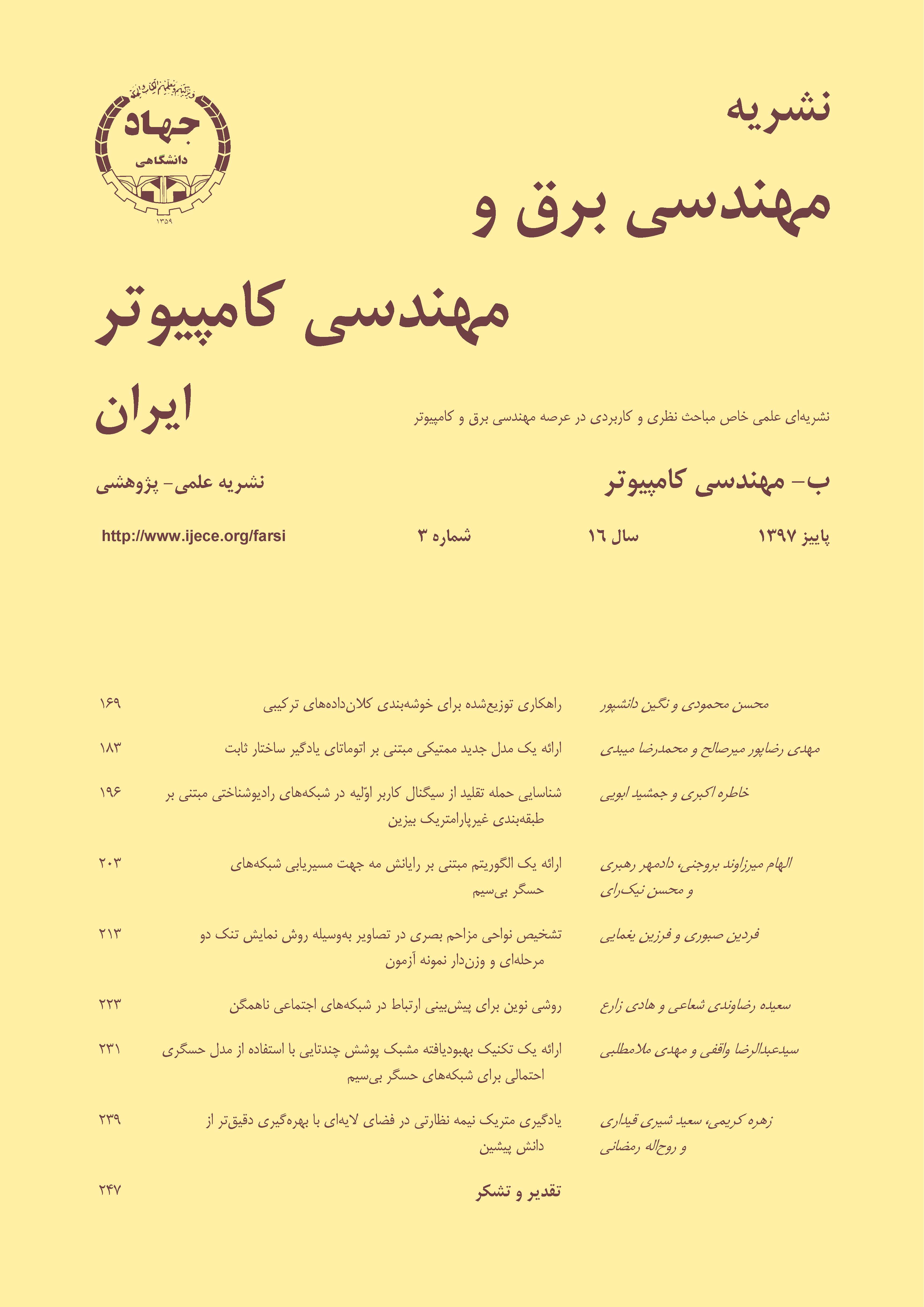 فهرست مقالات دسترسی آزاد مقاله صفحه چکیده متن کامل 1 - راهکاری توزیعشده برای خوشهبندی کلاندادههای ترکیبی محسن محمودی نگین دانشپور 20.1001.1.16823745.1397.16.3.10.0 دسترسی آزاد مقاله صفحه چکیده متن کامل 2 - ارائه يک مدل جديد ممتيکي مبتني بر اتوماتاي يادگير ساختار ثابت مهدي رضاپور ميرصالح محمدرضا میبدی 20.1001.1.16823745.1397.16.3.11.1 دسترسی آزاد مقاله صفحه چکیده متن کامل 3 - شناسایی حمله تقلید از سیگنال کاربر اولیه در شبکههای رادیوشناختی مبتنی بر طبقهبندی غیر پارامتریک بیزین خاطره اکبری جمشید ابویی 20.1001.1.16823745.1397.16.3.12.2 دسترسی آزاد مقاله صفحه چکیده متن کامل 4 - ارائه یک الگوریتم مبتنی بر رایانش مه جهت مسیریابی شبکههای حسگر بیسیم الهام میرزاوند بروجنی دادمهر رهبری محسن نیکرای 20.1001.1.16823745.1397.16.3.13.3 دسترسی آزاد مقاله صفحه چکیده متن کامل 5 - تشخیص نواحی مزاحم بصری در تصاویر به وسیله روش نمایش تنک دومرحلهای و وزندار نمونه آزمون فردین صبوری فرزین یغمایی 20.1001.1.16823745.1397.16.3.14.4 دسترسی آزاد مقاله صفحه چکیده متن کامل 6 - روشی نوین برای پیشبینی ارتباط در شبکههای اجتماعی ناهمگن سعیده رضاوندی شعاعی هادی زارع 20.1001.1.16823745.1397.16.3.15.5 دسترسی آزاد مقاله صفحه چکیده متن کامل 7 - ارائه يك تكنيك بهبوديافته مشبك پوشش چندتايي با استفاده از مدل حسگري احتمالي براي شبكههاي حسگر بيسيم عبدالرضا واقفی مهدی ملامطلبی 20.1001.1.16823745.1397.16.3.16.6 دسترسی آزاد مقاله صفحه چکیده متن کامل 8 - یادگیری متریک نیمه نظارتی در فضای لایهای با بهرهگیری دقیقتر از دانش پیشین زهره کریمی سعید شیری قیداری روحاله رمضانی 20.1001.1.16823745.1397.16.3.17.7