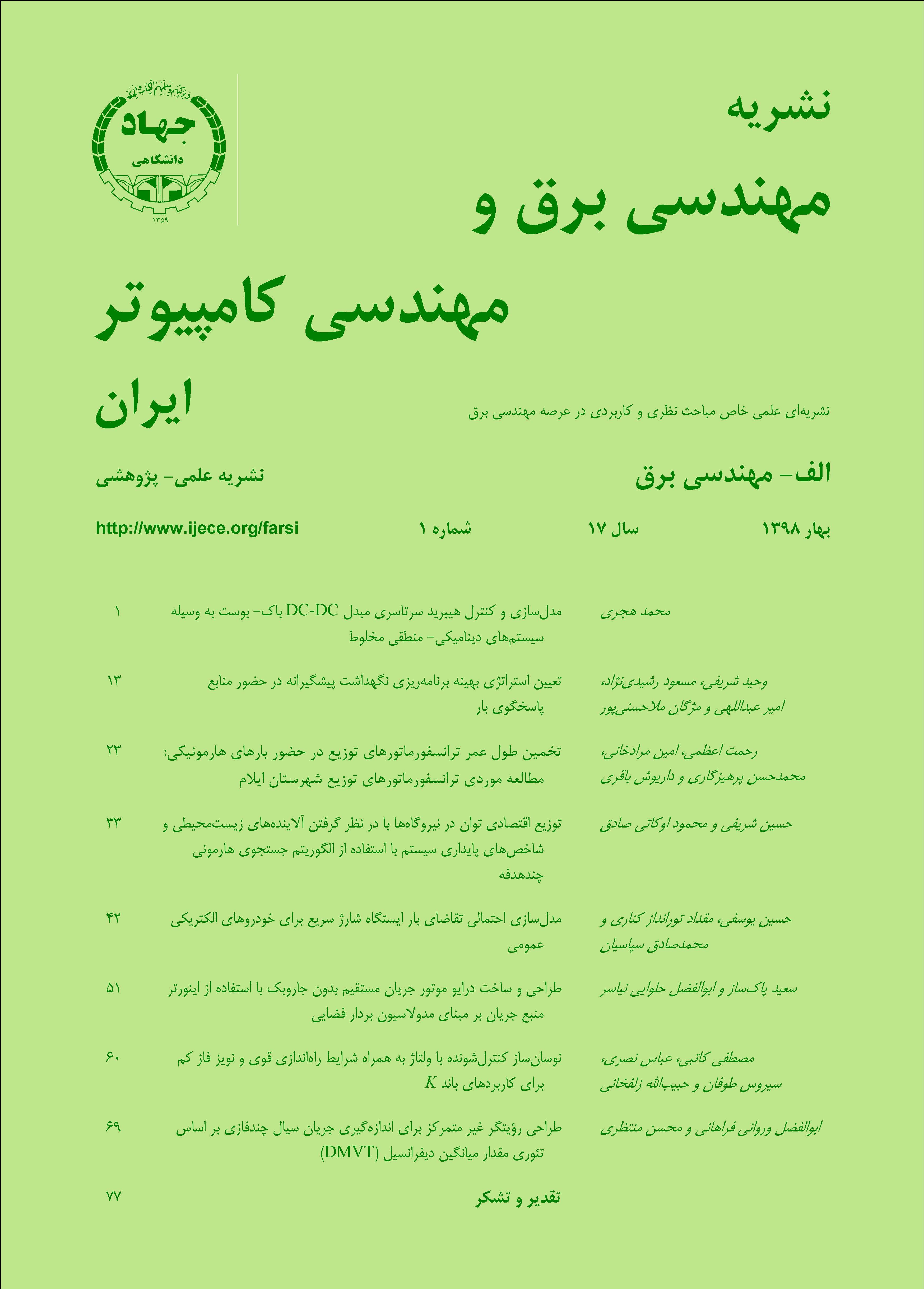 فهرست مقالات دسترسی آزاد مقاله صفحه چکیده متن کامل 1 - مدلسازی و کنترل هیبرید سرتاسری مبدل DC-DC باک- بوست به وسیله سیستمهای دینامیکی- منطقی مخلوط محمد هجری 20.1001.1.16823745.1398.17.1.1.4 دسترسی آزاد مقاله صفحه چکیده متن کامل 2 - تعیین استراتژی بهینه برنامهریزی نگهداشت پیشگیرانه در حضور منابع پاسخگوی بار وحید شریفی مسعود رشیدینژاد امیر عبداللهی مژگان ملاحسنیپور 20.1001.1.16823745.1398.17.1.2.5 دسترسی آزاد مقاله صفحه چکیده متن کامل 3 - تخمین طول عمر ترانسفورماتورهای توزیع در حضور بارهای هارمونیکی: مطالعه موردی ترانسفورماتورهای توزیع شهرستان ایلام رحمت اعظمی امین مرادخانی محمدحسن پرهیزگاری داریوش باقری 20.1001.1.16823745.1398.17.1.3.6 دسترسی آزاد مقاله صفحه چکیده متن کامل 4 - توزیع اقتصادی توان در نیروگاهها با در نظر گرفتن آلایندههای زیستمحیطی و شاخصهای پایداری سیستم با استفاده از الگوریتم جستجوی هارمونی چندهدفه حسین شریفی محمود اوکاتی صادق 20.1001.1.16823745.1398.17.1.4.7 دسترسی آزاد مقاله صفحه چکیده متن کامل 5 - مدلسازی احتمالی تقاضای بار ایستگاه شارژ سریع برای خودروهای الکتریکی عمومی حسین یوسفی مقداد تورانداز کناری محمدصادق سپاسیان 20.1001.1.16823745.1398.17.1.5.8 دسترسی آزاد مقاله صفحه چکیده متن کامل 6 - طراحی و ساخت درایو موتور جریان مستقیم بدون جاروبک با استفاده از اینورتر منبع جریان بر مبنای مدولاسیون بردار فضایی سعید پاکساز ابوالفضل حلوایی نیاسر 20.1001.1.16823745.1398.17.1.6.9 دسترسی آزاد مقاله صفحه چکیده متن کامل 7 - نوسانساز کنترلشونده با ولتاژ به همراه شرایط راهاندازی قوی و نویز فاز کم برای کاربردهای باند K مصطفی کاتبی عباس نصری سیروس طوفان حبیبالله زلفخانی 20.1001.1.16823745.1398.17.1.7.0 دسترسی آزاد مقاله صفحه چکیده متن کامل 8 - طراحی رؤیتگر غیر متمرکز برای اندازهگیری جریان سیال چندفازی بر اساس تئوری مقدار میانگین دیفرانسیل (DMVT) ابوالفضل وروانی فراهانی محسن منتظری 20.1001.1.16823745.1398.17.1.8.1