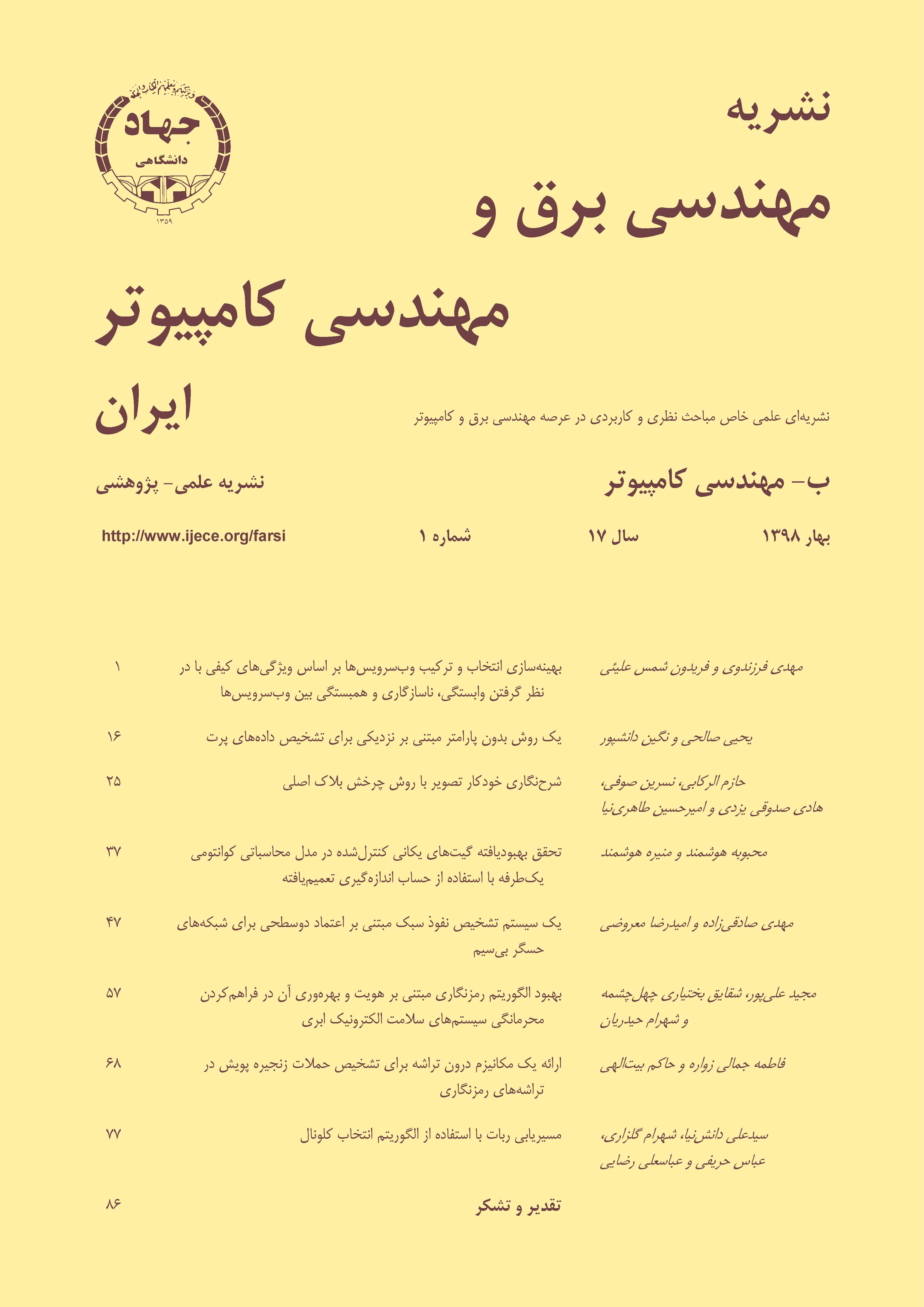 فهرست مقالات دسترسی آزاد مقاله صفحه چکیده متن کامل 1 - بهینهسازی انتخاب و ترکیب وبسرویسها بر اساس ویژگیهای کیفی با در نظر گرفتن وابستگی، ناسازگاری و همبستگی بین وبسرویسها مهدی فرزندوی فريدون شمس 20.1001.1.16823745.1398.17.1.9.2 دسترسی آزاد مقاله صفحه چکیده متن کامل 2 - یک روش بدون پارامتر مبتنی بر نزدیکی برای تشخیص دادههای پرت یحیی صالحی نگین دانشپور 20.1001.1.16823745.1398.17.1.10.3 دسترسی آزاد مقاله صفحه چکیده متن کامل 3 - شرحنگاری خودکار تصویر با روش چرخش بلاک اصلی حازم الرکابی نسرین صوفی هادی صدوقی یزدی امیرحسین طاهرینیا 20.1001.1.16823745.1398.17.1.11.4 دسترسی آزاد مقاله صفحه چکیده متن کامل 4 - تحقق بهبودیافته گیتهای یکانی کنترلشده در مدل محاسباتی کوانتومی یکطرفه با استفاده از حساب اندازهگیری تعمیمیافته محبوبه هوشمند منیره هوشمند 20.1001.1.16823745.1398.17.1.12.5 دسترسی آزاد مقاله صفحه چکیده متن کامل 5 - یک سیستم تشخیص نفوذ سبک مبتنی بر اعتماد دوسطحی برای شبکههای حسگر بیسیم مهدی صادقی زاده امیدرضا معروضی 20.1001.1.16823745.1398.17.1.13.6 دسترسی آزاد مقاله صفحه چکیده متن کامل 6 - بهبود الگوریتم رمزنگاری مبتنی بر هویت و بهرهوری آن در فراهمکردن محرمانگی سیستمهای سلامت الکترونیک ابری مجید علیپور شقایق بختیاری چهلچشمه شهرام حیدریان 20.1001.1.16823745.1398.17.1.14.7 دسترسی آزاد مقاله صفحه چکیده متن کامل 7 - ارائه یک مکانیزم درون تراشه برای تشخیص حملات زنجیره پویش در تراشههای رمزنگاری فاطمه جمالی زواره حاکم بیتالهی 20.1001.1.16823745.1398.17.1.15.8 دسترسی آزاد مقاله صفحه چکیده متن کامل 8 - مسیریابی ربات با استفاده از الگوریتم انتخاب کلونال سید علی دانش نیا شهرام گلزاري عباس حریفی عباسعلی رضائی 20.1001.1.16823745.1398.17.1.16.9