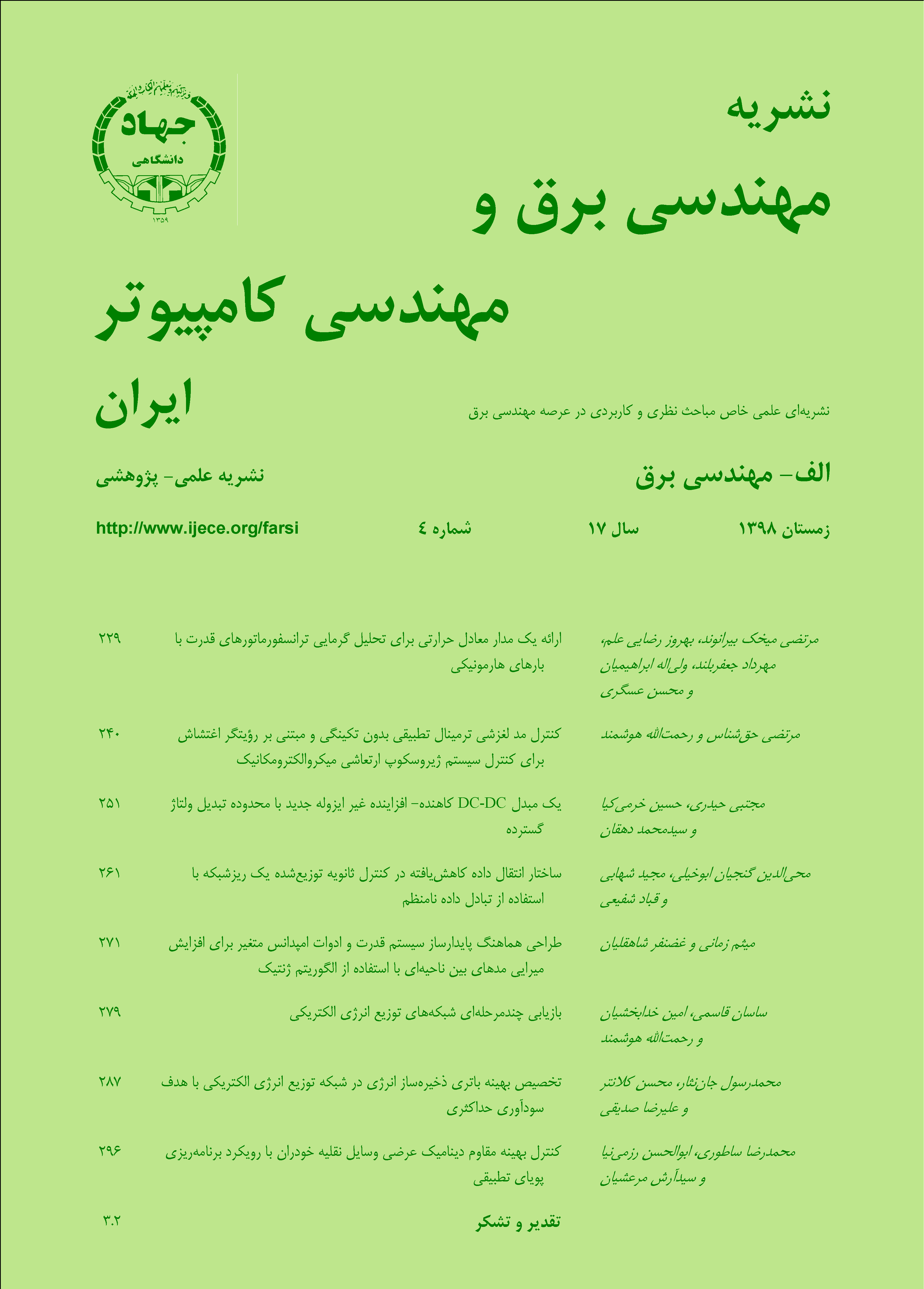 فهرست مقالات دسترسی آزاد مقاله صفحه چکیده متن کامل 1 - ارائه یک مدار معادل حرارتی برای تحلیل گرمایی ترانسفورماتورهای قدرت با بارهای هارمونیکی مرتضی میخک بیرانوند بهروز رضایی علم مهرداد جعفربلند ولیاله ابراهیمیان محسن عسگری 20.1001.1.16823745.1398.17.4.1.0 دسترسی آزاد مقاله صفحه چکیده متن کامل 2 - کنترل مد لغزشی ترمینال تطبیقی بدون تکینگی و مبتنی بر رؤیتگر اغتشاش برای کنترل سیستم ژیروسکوپ ارتعاشی میکروالکترومکانیک محمدرضا سلطانپور 20.1001.1.16823745.1398.17.4.2.1 دسترسی آزاد مقاله صفحه چکیده متن کامل 3 - یک مبدل DC-DC کاهنده- افزاینده غیر ایزوله جدید با محدوده تبدیل ولتاژ گسترده مجتبی حیدری حسین خرمیکیا سید محمد دهقان 20.1001.1.16823745.1398.17.4.3.2 دسترسی آزاد مقاله صفحه چکیده متن کامل 4 - ساختار انتقال داده کاهشیافته در کنترل ثانویه توزیعشده یک ریزشبکه با استفاده از تبادل داده نامنظم محی الدین گنجیان ابوخیلی مجید شهابی قباد شفیعی 20.1001.1.16823745.1398.17.4.4.3 دسترسی آزاد مقاله صفحه چکیده متن کامل 5 - طراحی هماهنگ پایدارساز سیستم قدرت و ادوات امپدانس متغیر برای افزایش میرایی مدهای بین ناحیهای با استفاده از الگوریتم ژنتیک میثم زمانی غضنفر شاهقلیان 20.1001.1.16823745.1398.17.4.5.4 دسترسی آزاد مقاله صفحه چکیده متن کامل 6 - بازیابی چندمرحلهای شبکههای توزیع انرژی الکتریکی ساسان قاسمی امین خدابخشیان رحمتالله هوشمند 20.1001.1.16823745.1398.17.4.6.5 دسترسی آزاد مقاله صفحه چکیده متن کامل 7 - تخصیص بهینه باتری ذخیرهساز انرژی در شبکه توزیع انرژی الکتریکی با هدف سودآوری حداکثری محمد رسول جان نثار محسن کلانتر علیرضا صدیقی انارکی 20.1001.1.16823745.1398.17.4.7.6 دسترسی آزاد مقاله صفحه چکیده متن کامل 8 - کنترل بهینه مقاوم دینامیک عرضی وسایل نقلیه خودران با رویکرد برنامهریزی پویای تطبیقی محمدرضا ساطوری ابوالحسن رزمی نیا آرش مرعشیان 20.1001.1.16823745.1398.17.4.8.7
