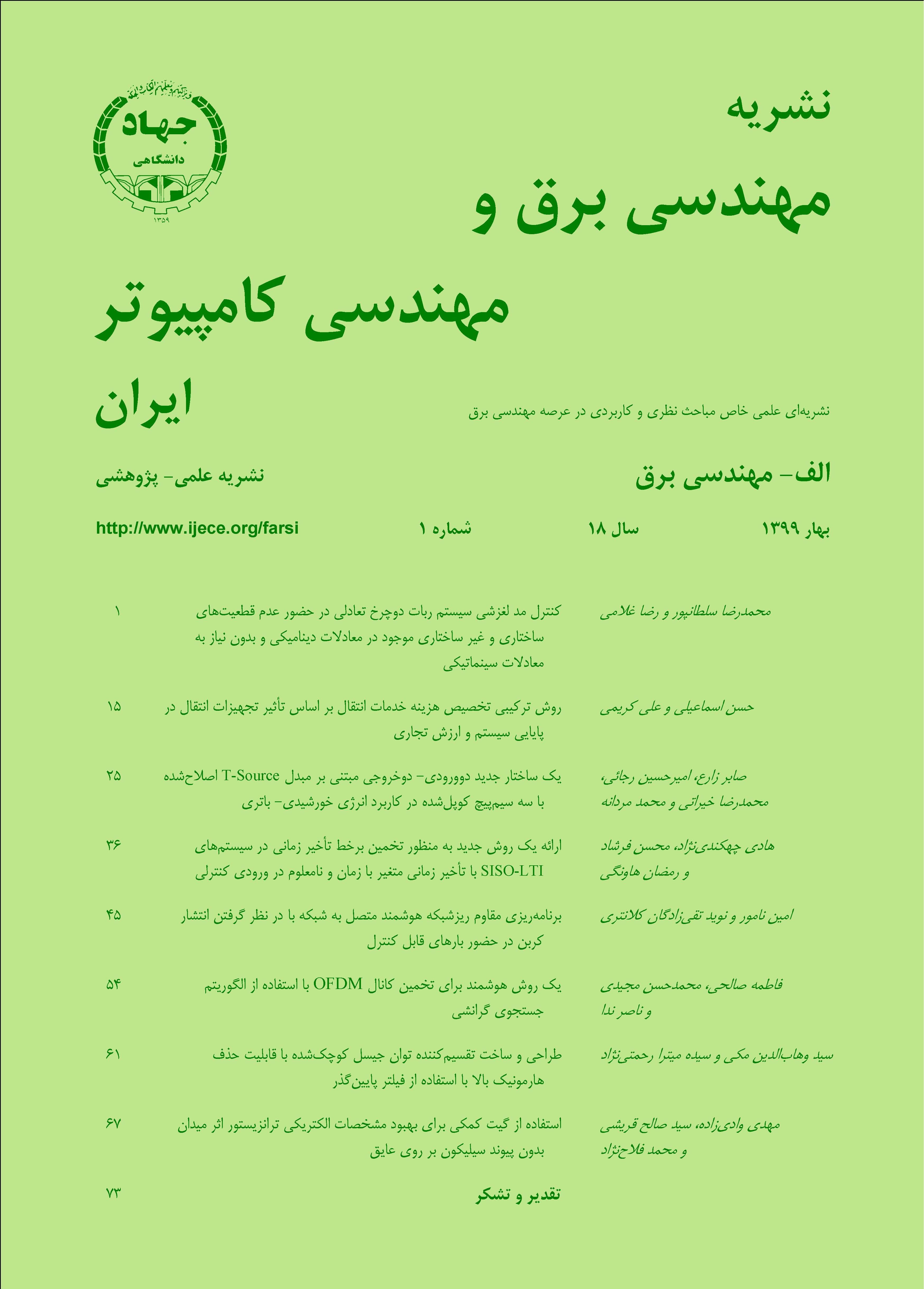 فهرست مقالات دسترسی آزاد مقاله صفحه چکیده متن کامل 1 - ارائه یک روش جدید به منظور تخمین برخط تأخیر زمانی در سیستمهای SISO-LTI با تأخیر زمانی متغیر با زمان و نامعلوم در ورودی کنترلی هادی چهکندی نژاد محسن فرشاد رمضان هاونگی 20.1001.1.16823745.1399.18.1.1.1 دسترسی آزاد مقاله صفحه چکیده متن کامل 2 - استفاده از گیت کمکی برای بهبود مشخصات الکتریکی ترانزیستور اثر میدان بدون پیوند سیلیکون بر روی عایق مهدی وادیزاده 20.1001.1.16823745.1399.18.1.2.2 دسترسی آزاد مقاله صفحه چکیده متن کامل 3 - برنامهریزی مقاوم ریزشبکه هوشمند متصل به شبکه با در نظر گرفتن انتشار کربن در حضور بارهای قابل کنترل امین نامور نوید تقی زادگان کلانتری 20.1001.1.16823745.1399.18.1.3.3 دسترسی آزاد مقاله صفحه چکیده متن کامل 4 - روش ترکیبی تخصیص هزینه خدمات انتقال بر اساس تأثیر تجهیزات انتقال در پایایی سیستم و ارزش تجاری حسن اسماعیلی علی کریمی 20.1001.1.16823745.1399.18.1.4.4 دسترسی آزاد مقاله صفحه چکیده متن کامل 5 - طراحی و ساخت تقسیمکننده توان جیسل کوچکشده با قابلیت حذف هارمونیک بالا با استفاده از فیلتر پایینگذر سید وهاب الدین مکی سیده میترا رحمتی نژاد 20.1001.1.16823745.1399.18.1.5.5 دسترسی آزاد مقاله صفحه چکیده متن کامل 6 - یک ساختار جدید دوورودی- دوخروجی مبتنی بر مبدل T-Source اصلاحشده با سه سیمپیچ کوپلشده در کاربرد انرژی خورشیدی- باتری صابر زارع امیرحسین رجائی محمدرضا خیراتی محمد مردانه 20.1001.1.16823745.1399.18.1.6.6 دسترسی آزاد مقاله صفحه چکیده متن کامل 7 - کنترل مد لغزشی سیستم ربات دوچرخ تعادلی در حضور عدم قطعیتهای ساختاری و غیر ساختاری موجود در معادلات دینامیکی و بدون نیاز به معادلات سینماتیکی محمدرضا سلطانپور رضا غلامي 20.1001.1.16823745.1399.18.1.7.7 دسترسی آزاد مقاله صفحه چکیده متن کامل 8 - یک روش هوشمند برای تخمین کانال OFDM با استفاده از الگوریتم جستجوی گرانشی فاطمه صالحی محمد حسن مجیدی ناصر ندا 20.1001.1.16823745.1399.18.1.8.8