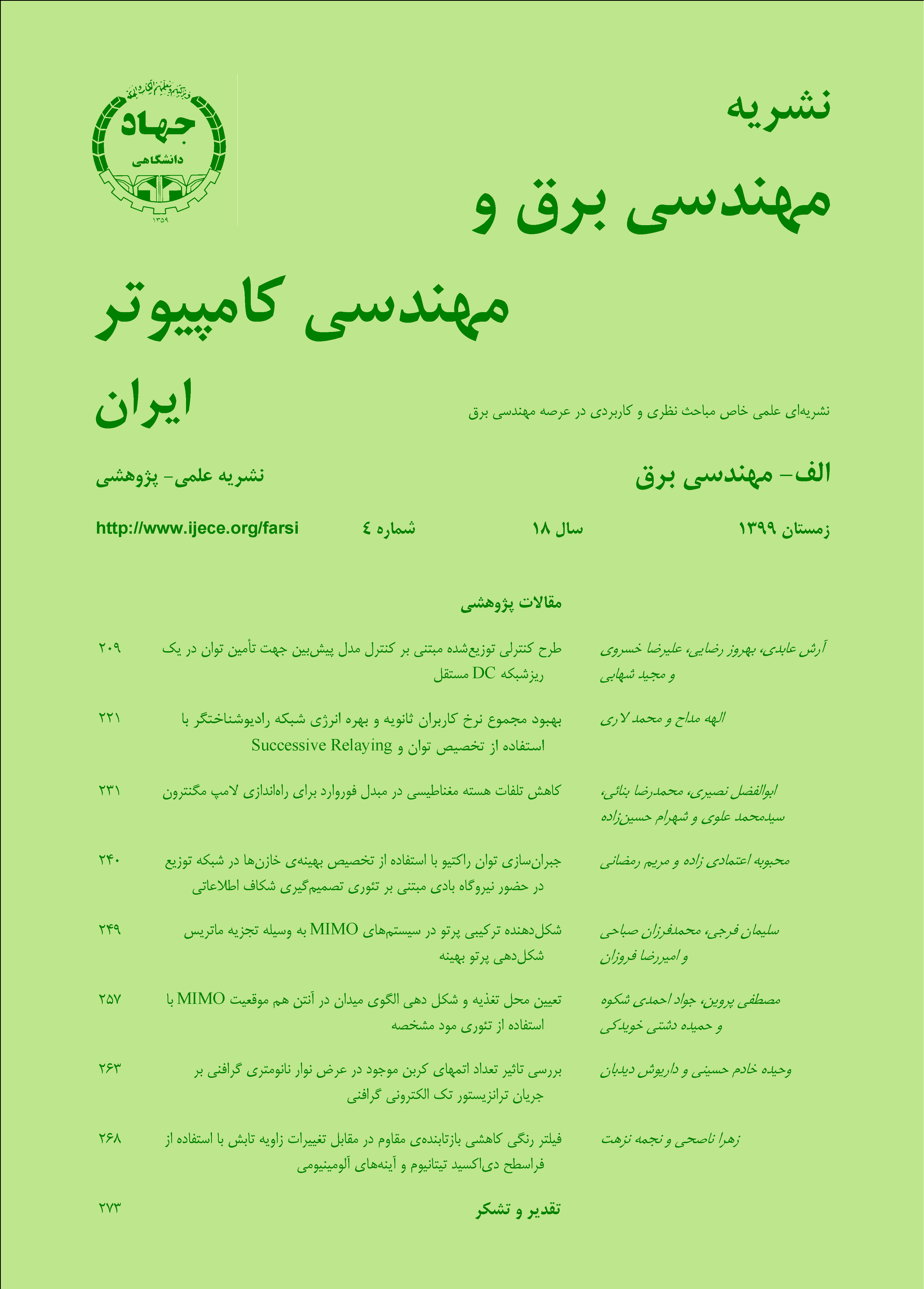فهرست مقالات دسترسی آزاد مقاله صفحه چکیده متن کامل 1 - تعیین محل تغذیه و شکل دهی الگوی میدان در آنتن هم موقعیت MIMO با استفاده از تئوری مود مشخصه مصطفی پروین جواد احمدی شکوه حمیده دشتی خویدکی 20.1001.1.16823745.1399.18.4.1.7 دسترسی آزاد مقاله صفحه چکیده متن کامل 2 - کاهش تلفات هسته مغناطیسی در مبدل فوروارد برای راه اندازی لامپ مگنترون محمدرضا بنائي ابوالفضل نصیری سید محمد علوی شهرام حسین زاده 20.1001.1.16823745.1399.18.4.2.8 دسترسی آزاد مقاله صفحه چکیده متن کامل 3 - جبران سازی توان راکتیو با استفاده از تخصیص بهینه ی خازن ها در شبکه توزیع در حضور نیروگاه بادی مبتنی بر تئوری تصمیم گیری شکاف اطلاعاتی مریم رمضانی محبوبه اعتمادی زاده 20.1001.1.16823745.1399.18.4.3.9 دسترسی آزاد مقاله صفحه چکیده متن کامل 4 - شکل دهنده ترکیبی پرتو در سیستم های MIMO به وسیله تجزیه ماتریس شکل دهی پرتو بهینه محمدفرزان صباحی سلیمان فرجی امیررضا فروزان 20.1001.1.16823745.1399.18.4.4.0 دسترسی آزاد مقاله صفحه چکیده متن کامل 5 - طرح کنترلی توزیع شده مبتنی بر کنترل مدل پیشبین جهت تأمین توان در یک ریزشبکه DC مستقل آرش عابدی بهروز رضایی علیرضا خسروی مجید شهابی 20.1001.1.16823745.1399.18.4.5.1 دسترسی آزاد مقاله صفحه چکیده متن کامل 6 - بررسی تاثیر تعداد اتمهای کربن موجود در عرض نوار نانومتری گرافنی بر جریان ترانزیستور تک الکترونی گرافنی داریوش دیدبان وحیده خادم حسینی 20.1001.1.16823745.1399.18.4.6.2 دسترسی آزاد مقاله صفحه چکیده متن کامل 7 - بهبود مجموع نرخ کاربران ثانویه و بهره انرژی شبکه رادیوشناختگر با استفاده از تخصیص توان و Successive Relaying الهه مداح محمد لاری 20.1001.1.16823745.1399.18.4.7.3 دسترسی آزاد مقاله صفحه چکیده متن کامل 8 - فیلتر رنگي كاهشي بازتابنده مقاوم در مقابل تغييرات زاويه تابش با استفاده از فراسطح دياکسيد تيتانيوم و آينههاي آلومينيومي زهرا ناصحي نجمه نزهت 20.1001.1.16823745.1399.18.4.8.4