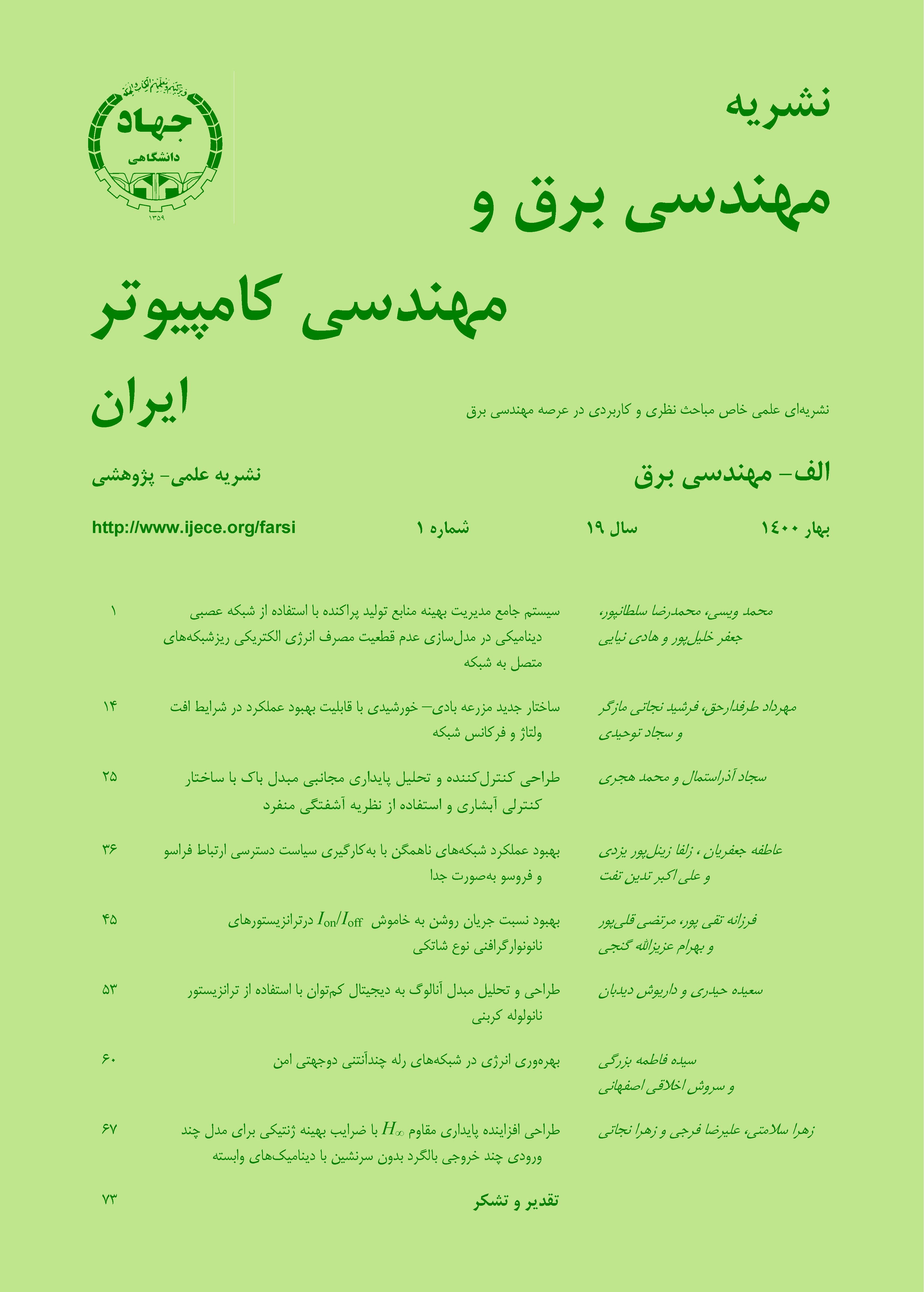 فهرست مقالات دسترسی آزاد مقاله صفحه چکیده متن کامل 1 - بهبود عملکرد شبکه های ناهمگن با به کارگیری سیاست دسترسی ارتباط فراسو و فروسو به صورت جدا عاطفه جعفریان زلفا زینل پوریزدی علی اکبر تدین تفت 20.1001.1.16823745.1400.19.1.15.2 دسترسی آزاد مقاله صفحه چکیده متن کامل 2 - طراحي و تحلیل مبدل آنالوگ به ديجيتال کمتوان با استفاده از ترانزيستور نانولوله کربني سعیده حیدری داریوش دیدبان 20.1001.1.16823745.1400.19.1.1.8 دسترسی آزاد مقاله صفحه چکیده متن کامل 3 - طراحی کنترلکننده و تحلیل پایداری مجانبی مبدل باک با ساختار کنترلی آبشاری و استفاده از نظریه آشفتگی منفرد سجاد آذراستمال محمد هجری 20.1001.1.16823745.1400.19.1.2.9 دسترسی آزاد مقاله صفحه چکیده متن کامل 4 - بهبود نسبت جریان روشن به خاموش Ion/Ioff درترانزیستورهای نانونوارگرافنی نوع شاتکی فرزانه تقی پور مرتضی قلی پور بهرام عزیزالله گنجی 20.1001.1.16823745.1400.19.1.3.0 دسترسی آزاد مقاله صفحه چکیده متن کامل 5 - سیستم جامع مدیریت بهینه منابع تولید پراکنده با استفاده از شبکه عصبی دینامیکی در مدلسازی عدم قطعیت مصرف انرژی الکتریکی ریزشبکههای متصل به شبکه محمد ویسی محمدرضا سلطانپور جعفر خلیل پور هادی نیایی 20.1001.1.16823745.1400.19.1.4.1 دسترسی آزاد مقاله صفحه چکیده متن کامل 6 - طراحی افزاینده پایداری مقاوم ∞H با ضرایب بهینه ژنتیکی برای مدل چند ورودی چند خروجی بالگرد بدون سرنشین با دینامیک¬های وابسته زهرا سلامتی زهرا نجاتی علیرضا فرجی 20.1001.1.16823745.1400.19.1.5.2 دسترسی آزاد مقاله صفحه چکیده متن کامل 7 - ساختار جدید مزرعه بادی– خورشیدی با قابلیت بهبود عملکرد در شرایط افت ولتاژ و فرکانس شبکه مهرداد طرفدارحق فرشید نجاتی مازگر سجاد توحیدی 20.1001.1.16823745.1400.19.1.6.3 دسترسی آزاد مقاله صفحه چکیده متن کامل 8 - بهرهوری انرژی در شبکههای رله چندآنتنی دوجهتی امن سیده فاطمه بزرگی سروش اخلاقی 20.1001.1.16823745.1400.19.1.7.4