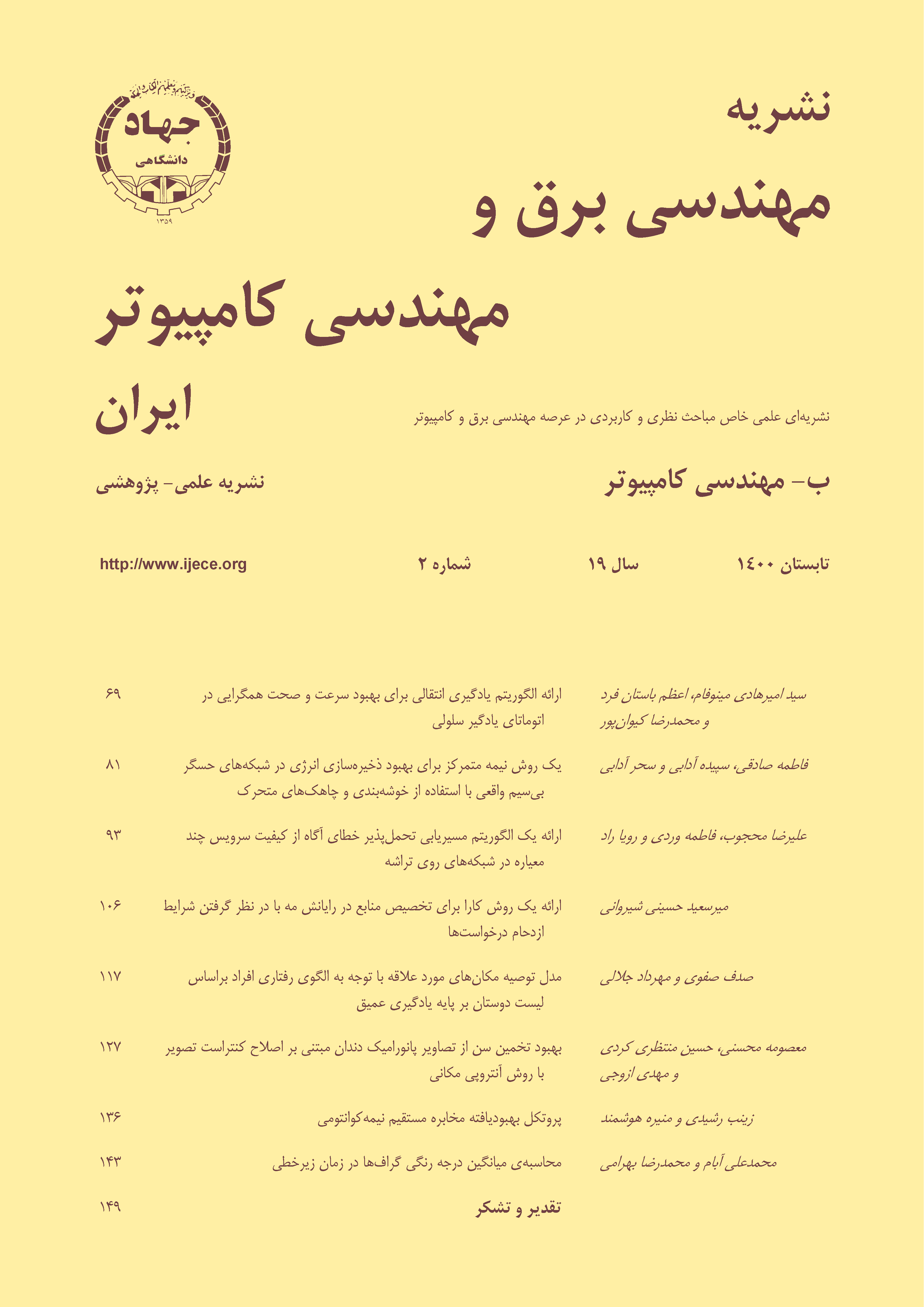 فهرست مقالات دسترسی آزاد مقاله صفحه چکیده متن کامل 1 - ارائه الگوریتم یادگیری انتقالی برای بهبود سرعت و صحت همگرایی در اتوماتای یادگیر سلولی سید امیرهادی مینوفام اعظم باستان فرد محمدرضا کیوانپور 20.1001.1.16823745.1400.19.2.11.0 دسترسی آزاد مقاله صفحه چکیده متن کامل 2 - یک روش نیمهمتمرکز برای بهبود ذخیرهسازی انرژی در شبکههای حسگر بیسیم واقعی با استفاده از خوشهبندی و چاهکهای متحرک فاطمه صادقی سپیده آدابی سحر آدایی 20.1001.1.16823745.1400.19.2.14.3 دسترسی آزاد مقاله صفحه چکیده متن کامل 3 - ارائه یک الگوریتم مسیریابی تحملپذیر خطای آگاه از کیفیت سرویس چندمعیاره در شبکههای روی تراشه علیرضا محجوب فاطمه وردی رویا راد 20.1001.1.16823745.1400.19.2.12.1 دسترسی آزاد مقاله صفحه چکیده متن کامل 4 - حل مسئله بهینهسازی چندهدفه جایگذاری ماشینهای مجازی در مراکز دادهای ابر با رویکرد کمینهسازی مصرف انرژی و هدررفت منابع با الگوریتم تبرید فلزات میرسعید حسینی شیروانی 20.1001.1.16823745.1400.19.2.15.4 دسترسی آزاد مقاله صفحه چکیده متن کامل 5 - مدل توصیه مکانهای مورد علاقه با توجه به الگوی رفتاری افراد بر اساس لیست دوستان بر پایه یادگیری عمیق صدف صفوی مهرداد جلالی 20.1001.1.16823745.1400.19.2.16.5 دسترسی آزاد مقاله صفحه چکیده متن کامل 6 - بهبود تخمین سن از تصاویر پانورامیک دندان مبتني بر اصلاح کنتراست تصویر با روش آنتروپی مکانی معصومه محسنی حسین منتظری کردی مهدي ازوجي 20.1001.1.16823745.1400.19.2.13.2 دسترسی آزاد مقاله صفحه چکیده متن کامل 7 - پروتکل بهبودیافته مخابره مستقیم نیمهکوانتومی زینب رشیدی منیره هوشمند 20.1001.1.16823745.1400.19.2.9.8 دسترسی آزاد مقاله صفحه چکیده متن کامل 8 - محاسبه میانگین درجه رنگی گرافها در زمان زیرخطی محمدعلی آبام محمدرضا بهرامی 20.1001.1.16823745.1400.19.2.10.9