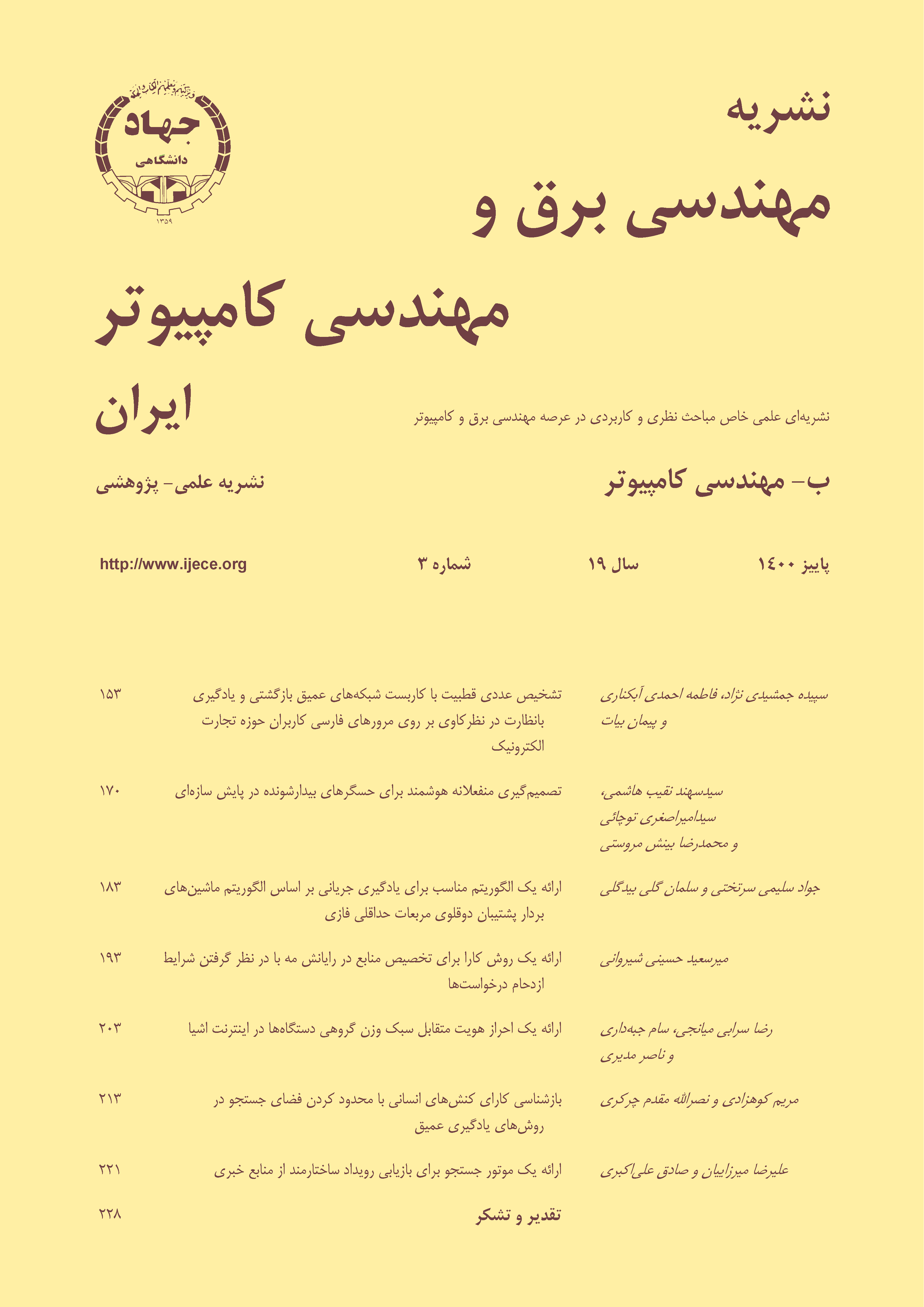 فهرست مقالات دسترسی آزاد مقاله صفحه چکیده متن کامل 1 - تشخیص عددی قطبیت با کاربست شبکههای عمیق بازگشتی و یادگیری بانظارت در نظرکاوی بر روی مرورهای فارسی کاربران حوزه تجارت الکترونیک سپیده جمشیدی نژاد فاطمه احمدی آبکناری پیمان بیات 20.1001.1.16823745.1400.19.3.15.6 دسترسی آزاد مقاله صفحه چکیده متن کامل 2 - تصمیم گیری منفعلانه هوشمند برای حسگرهای بیدارشونده در پایش سازهای سیدسهند نقیب هاشمی سید امیر اصغری توچائی محمدرضا بینش مروستی 20.1001.1.16823745.1400.19.3.2.3 دسترسی آزاد مقاله صفحه چکیده متن کامل 3 - ارائه یک الگوریتم مناسب برای یادگیری جریانی بر اساس الگوریتم ماشینهای بردار پشتیبان دوقلوی مربعات حداقلی فازی جواد سلیمی سرتختی سلمان گلی 20.1001.1.16823745.1400.19.3.3.4 دسترسی آزاد مقاله صفحه چکیده متن کامل 4 - طراحی بهینه و زیربهینه فرستنده- گیرنده در شبکههای حسگری متراکم و اینترنت اشیاء فرزاد حسین پناهی فریدون حسین پناهی زهرا عسکری زاده اردستانی 20.1001.1.16823745.1400.19.3.4.5 دسترسی آزاد مقاله صفحه چکیده متن کامل 5 - ارائه یک احراز هویت متقابل سبک وزن گروهی دستگاه ها در اینترنت اشیا رضا سرابی میانجی سام جبه داری ناصر مدیری 20.1001.1.16823745.1400.19.3.5.6 دسترسی آزاد مقاله صفحه چکیده متن کامل 6 - بازشناسی کارای کنشهای انسانی با محدود کردن فضای جستجو در روشهای یادگیری عمیق مریم کوهزادی هیکویی نصرالله مقدم چرکری 20.1001.1.16823745.1400.19.3.6.7 دسترسی آزاد مقاله صفحه چکیده متن کامل 7 - ارائه یک موتور جستجو برای بازیابی رویداد ساختارمند از منابع خبری علیرضا میرزائیان صادق علی اکبری 20.1001.1.16823745.1400.19.3.7.8