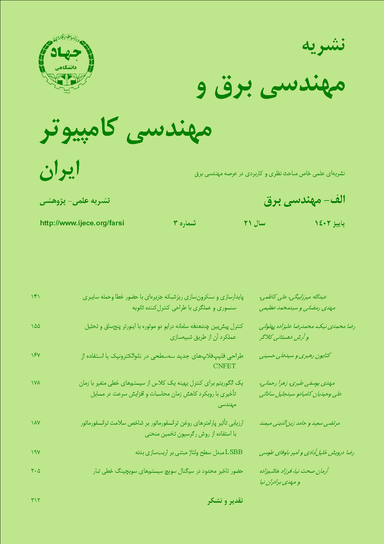 فهرست مقالات دسترسی آزاد مقاله صفحه چکیده متن کامل 1 - پایدارسازی و سنکرونسازی ریزشبکه جزیرهای با حضور خطا و حمله سایبری سنسوری و عملگری با طراحی کنترلکننده ثانویه عبدالله میرزابیگی علی کاظمی مهدی رمضانی سیدمحمد عظیمی دسترسی آزاد مقاله صفحه چکیده متن کامل 2 - کنترل پیشبین چندهدفه سامانه درایو دوموتوره با اینورتر پنج ساق رضا محمدی نیک محمدرضا علیزاده پهلوانی آرش دهستانی کلاگر دسترسی آزاد مقاله صفحه چکیده متن کامل 3 - طراحی فلیپفلاپهای جدید سهسطحی در نانوالکترونیک با استفاده از CNFET کتایون رهبری سیدعلی حسینی دسترسی آزاد مقاله صفحه چکیده متن کامل 4 - یک الگوریتم برای کنترل بهينه يك كلاس از سيستمهاي خطي متغير با زمان تأخیری با رویکرد کاهش زمان محاسبات و افزایش سرعت در مسائل مهندسی مهدی یوسفی طبری زهرا رحمانی علی وحیدیان کامیاد سیدجلیل ساداتی دسترسی آزاد مقاله صفحه چکیده متن کامل 5 - ارزیابی تأثیر پارامترهای روغن ترانسفورماتور بر شاخص سلامت ترانسفورماتور با استفاده از روش رگرسیون تخمین منحنی مرتضی سعید حامد زين الديني ميمند دسترسی آزاد مقاله صفحه چکیده متن کامل 6 - LSBB مبدل سطح ولتاژ مبتنی بر اریب سازی بدنه رضا درویش خلیل آبادی امیر باوفای طوسی دسترسی آزاد مقاله صفحه چکیده متن کامل 7 - حضور تأخیر محدود در سیگنال سوئیچ سیستمهای سوئیچینگ خطیتبار آرمان صحت نیا فرزاد هاشمزاده مهدی برادران نیا
