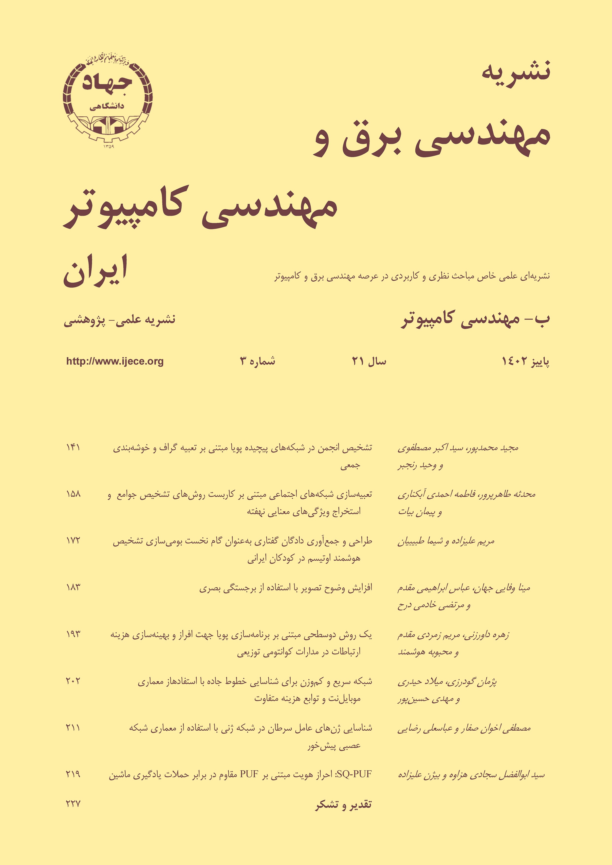 فهرست مقالات دسترسی آزاد مقاله صفحه چکیده متن کامل 1 - تشخیص انجمن در شبکههای پیچیده پویا مبتنی بر تعبیه گراف و خوشهبندی جمعی مجید محمدپور سیداکبر مصطفوی وحید رنجبر دسترسی آزاد مقاله صفحه چکیده متن کامل 2 - تعبیهسازی شبکههای اجتماعی مبتنی بر کاربست روشهای تشخیص جوامع و استخراج ویژگیهای معنایی نهفته محدثه طاهرپرور فاطمه احمدی آبکناری پیمان بیات دسترسی آزاد مقاله صفحه چکیده متن کامل 3 - طراحی و جمعآوری دادگان گفتاری بهعنوان گام نخست بومیسازی تشخیص هوشمند اوتیسم در کودکان ایرانی مریم علیزاده شیما طبیبیان دسترسی آزاد مقاله صفحه چکیده متن کامل 4 - افزایش وضوح تصویر با استفاده از برجستگی بصری مینا وفایی جهان عباس ابراهیمی مقدم مرتضی خادمی دسترسی آزاد مقاله صفحه چکیده متن کامل 5 - یک روش دوسطحی مبتنی بر برنامهسازی پویا جهت افراز و بهینهسازی هزینه ارتباطات در مدارات کوانتومی توزیعی زهره داورزنی مریم زمردی مقدم محبوبه هوشمند دسترسی آزاد مقاله صفحه چکیده متن کامل 6 - شبکه سریع و کموزن برای شناسایی خطوط جاده با استفاده از معماری موبایلنت و توابع هزینه متفاوت پژمان گودرزی میلاد حیدری مهدی حسین پور دسترسی آزاد مقاله صفحه چکیده متن کامل 7 - شناسایی ژنهای عامل سرطان در شبکه ژنی با استفاده از معماری شبکه عصبی پیشخور مصطفی اخوان صفار عباسعلی رضایی دسترسی آزاد مقاله صفحه چکیده متن کامل 8 - SQ-PUF: پروتکل احراز هویت مبتنی برPUF مقاوم در برابر حملات یادگیری ماشین سید ابوالفضل سجادی هزاوه بیژن علیزاده