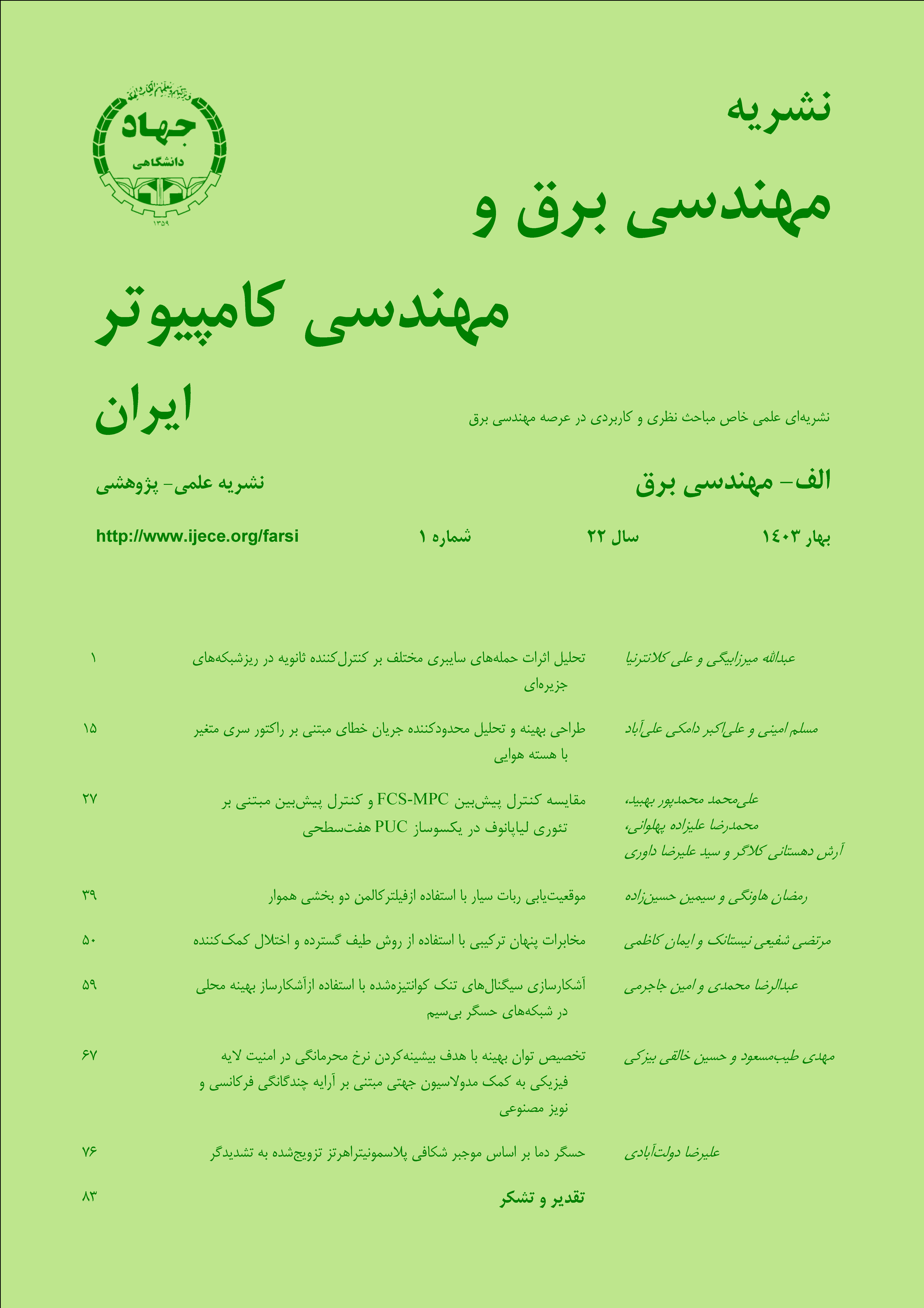 فهرست مقالات دسترسی آزاد مقاله صفحه چکیده متن کامل 1 - تحلیل اثرات حملههای سایبری مختلف بر کنترلکننده ثانویه در ریزشبکههای جزیرهای عبدالله میرزابیگی علی کلانترنیا دسترسی آزاد مقاله صفحه چکیده متن کامل 2 - طراحی بهینه و تحلیل محدودکننده جریان خطای مبتنی بر راکتور سری متغیر با هسته هوایی مسلم امینی فسخودی علی اکبر دامکی علی آباد دسترسی آزاد مقاله صفحه چکیده متن کامل 3 - مقایسه کنترل پیشبین FCS-MPC و کنترل پیشبین مبتنی بر تئوری لیاپانوف در یکسوساز PUC هفتسطحی علی محمد محمدپور بهبید محمدرضا علیزاده پهلوانی آرش دهستانی کلاگر علیرضا داوری دسترسی آزاد مقاله صفحه چکیده متن کامل 4 - موقعیت یابی ربات سیار با استفاده از فیلتر کالمن دو بخشی هموار رمضان هاونگی سیمین حسین زاده دسترسی آزاد مقاله صفحه چکیده متن کامل 5 - مخابرات پنهان ترکیبی با استفاده از روش طیف گسترده و اختلال کمک کننده مرتضی شفیعی نیستانک ایمان کاظمی دسترسی آزاد مقاله صفحه چکیده متن کامل 6 - آشکارسازی سیگنالهای تنک کوانتیزهشده با استفاده از آشکارساز بهینه محلی در شبکههای حسگر بیسیم عبدالرضا محمدی امین جاجرمی دسترسی آزاد مقاله صفحه چکیده متن کامل 7 - تخصیص توان بهینه با هدف بیشینهکردن نرخ محرمانگی در امنیت لایه فیزیکی به کمک مدولاسیون جهتی مبتنی بر آرایه چندگانگی فرکانسی و نویز مصنوعی مهدی طیب مسعود حسین خالقی دسترسی آزاد مقاله صفحه چکیده متن کامل 8 - حسگر دما بر اساس موجبر شکافی پلاسمونی تراهرتز تزویجشده به تشدیدگر علیرضا دولت آبادی