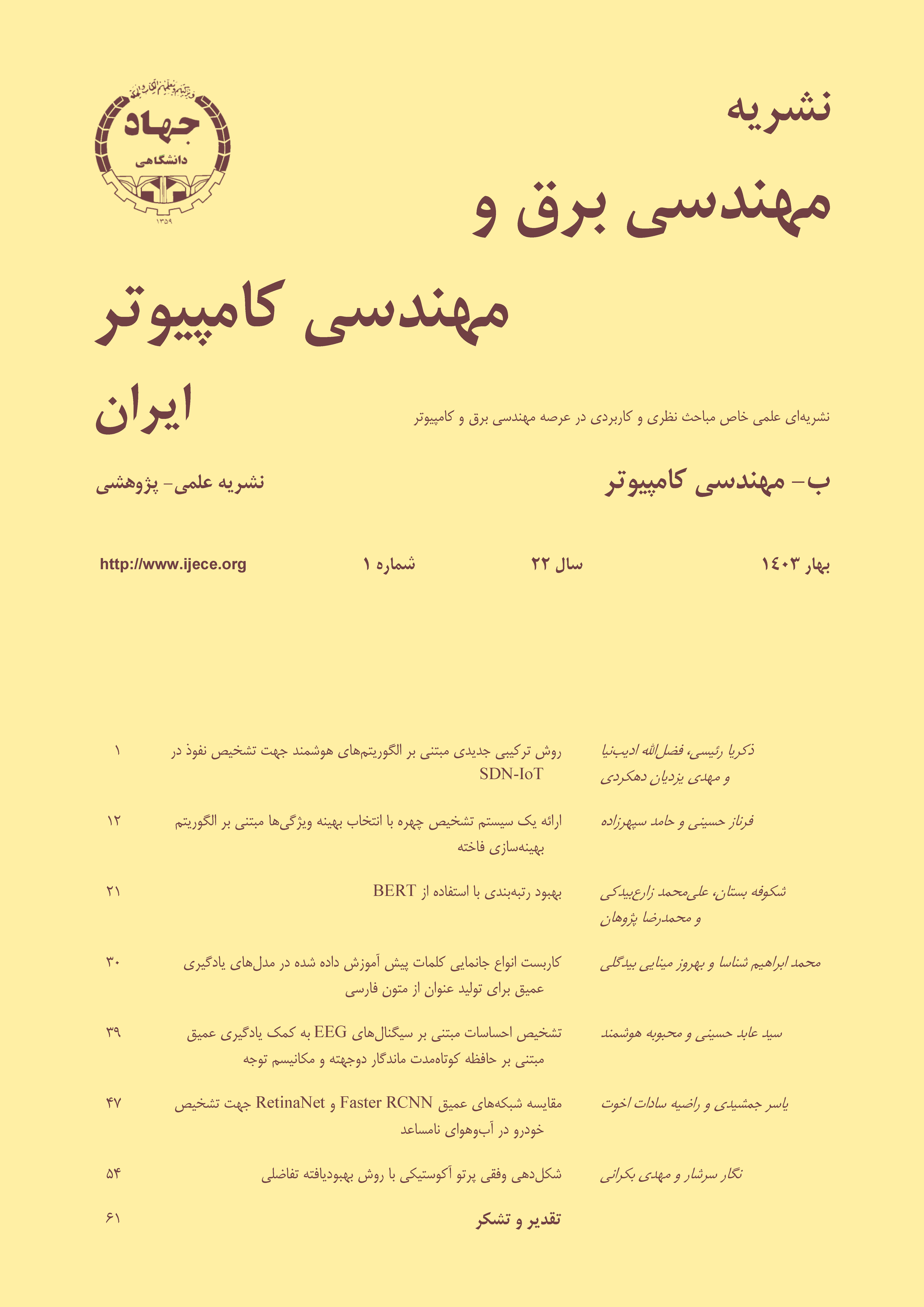 فهرست مقالات دسترسی آزاد مقاله صفحه چکیده متن کامل 1 - روش ترکیبی جدیدی مبتنی بر الگوریتم¬های هوشمند جهت تشخیص نفوذ در SDN-IoT ذکریا رئیسی فضلالله ادیبنیا مهدی یزدیان دهکردی دسترسی آزاد مقاله صفحه چکیده متن کامل 2 - ارائه یک سیستم تشخیص چهره با انتخاب بهینهی ویژگیها مبتنی بر الگوریتم بهینهسازی فاخته فرناز حسینی حامد سپهرزاده دسترسی آزاد مقاله صفحه چکیده متن کامل 3 - بهبود رتبهبندی با استفاده از BERT شکوفه بستان علی محمد زارع بیدکی محمدرضا پژوهان دسترسی آزاد مقاله صفحه چکیده متن کامل 4 - کاربست انواع جانمایی کلمات پیشآموزشدادهشده در مدلهای یادگیری عمیق برای تولید عنوان از متون فارسی محمد ابراهیم شناسا بهروز مینایی بیدگلی دسترسی آزاد مقاله صفحه چکیده متن کامل 5 - تشخیص احساسات مبتنی بر سیگنالهای EEG به کمک یادگیری عمیق مبتنی بر حافظه کوتاهمدت ماندگار دوجهته و مکانیسم توجه سیدعابد حسینی محبوبه هوشمند دسترسی آزاد مقاله صفحه چکیده متن کامل 6 - مقایسه شبکه های عمیق Faster RCNN و RetinaNet جهت تشخیص خودرو در آبوهوای نامساعد یاسر جمشیدی راضیه سادات اخوت دسترسی آزاد مقاله صفحه چکیده متن کامل 7 - شکلدهی وفقی پرتو آکوستیکی با روش بهبودیافته تفاضلی نگار سرشار مهدی بکرانی