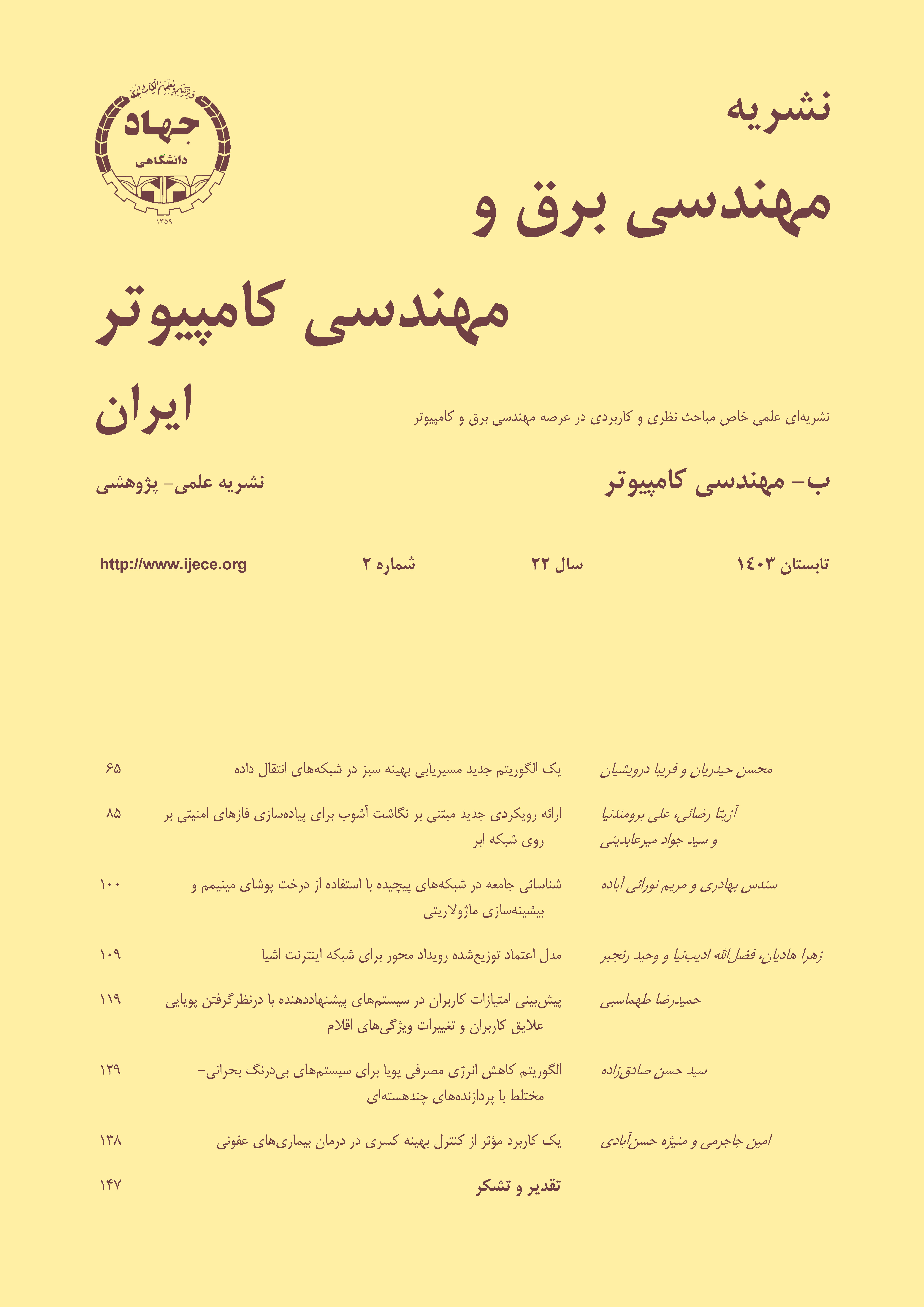 فهرست مقالات دسترسی آزاد مقاله صفحه چکیده متن کامل 1 - یک الگوریتم جدید مسیریابی بهینه سبز در شبکه های انتقال داده محسن حیدریان فریبا درویشیان دسترسی آزاد مقاله صفحه چکیده متن کامل 2 - ارائه رویکردی جدید مبتنی بر نگاشت آشوب برای پیاده سازی فازهای امنیتی برروی شبکه ی ابر آزیتا رضایی علی برومندنیا سیدجواد میرعابدینی دسترسی آزاد مقاله صفحه چکیده متن کامل 3 - شناسائی جامعه در شبکه¬های پیچیده با استفاده از درخت پوشای مینیمم و بیشینه¬سازی ماژولاریتی سندس بهادری مریم نورائی دسترسی آزاد مقاله صفحه چکیده متن کامل 4 - مدل اعتماد توزیعشده رویداد محور برای شبکه اينترنت اشيا زهرا هادیان فضل الله ادیب نیا وحید رنجبر دسترسی آزاد مقاله صفحه چکیده متن کامل 5 - پیشبینی امتیازات کاربران در سیستمهای پیشنهاددهنده با درنظرگرفتن پویایی علایق کاربران و تغییرات ویژگیهای اقلام حمیدرضا طهماسبی دسترسی آزاد مقاله صفحه چکیده متن کامل 6 - الگوریتم کاهش انرژی مصرفی پویا برای سیستمهای بیدرنگ بحرانی-مختلط با پردازندههای چندهستهای سید حسن صادق زاده دسترسی آزاد مقاله صفحه چکیده متن کامل 7 - یک کاربرد مؤثر از کنترل بهینه کسری در درمان بیماریهای عفونی امین جاجرمی منیژه حسن آبادی