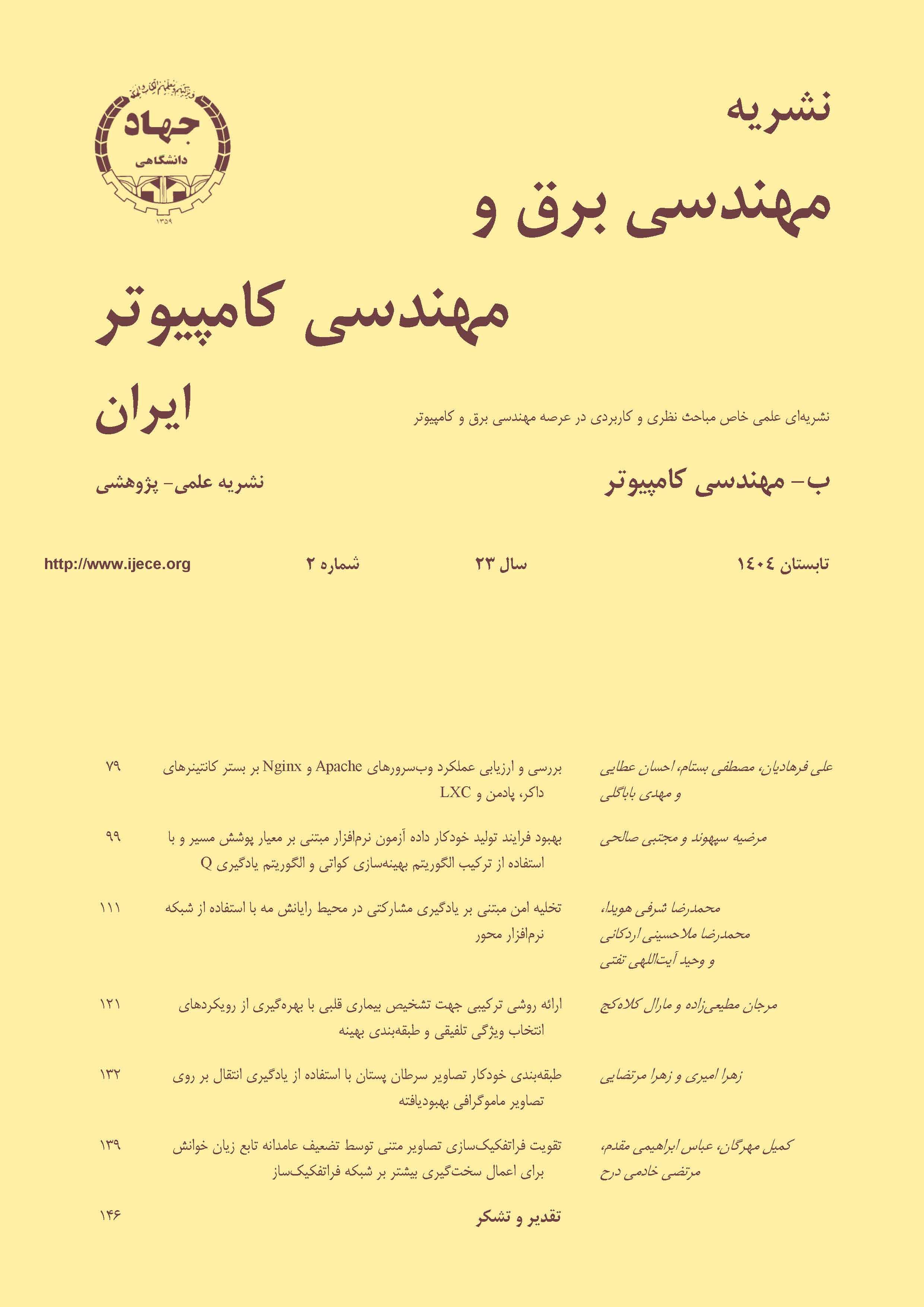 فهرست مقالات دسترسی آزاد مقاله صفحه چکیده متن کامل 1 - بررسی و ارزیابی عملکرد وبسرورهای Apache و Nginx بر بستر کانتینرهای داکر، پادمن و LXC علی فرهادیان مصطفی بستام احسان عطائی مهدی باباگلی دسترسی آزاد مقاله صفحه چکیده متن کامل 2 - بهبود فرایند تولید خودکار داده آزمون نرمافزار مبتنی بر معیار پوشش مسیر و با استفاده از ترکیب الگوریتم بهینه سازی کواتی و الگوریتم یادگیری Q مرضیه سپهوند مجتبی صالحی دسترسی آزاد مقاله صفحه چکیده متن کامل 3 - تخلیه امن مبتنی بر یادگیری مشارکتی در محیط رایانش مه با استفاده از شبکه نرمافزار محور محمدرضا شرفی هویدا محمد رضا ملاحسینی وحید آیت الهی تفتی دسترسی آزاد مقاله صفحه چکیده متن کامل 4 - ارائه روشی ترکیبی جهت تشخیص بیماری قلبی با بهره گیری از رویکردهای انتخاب ویژگی تلفیقی و طبقه بندی بهینه مارال كلاه كج مرجان مطیعی زاده دسترسی آزاد مقاله صفحه چکیده متن کامل 5 - طبقهبندی خودکار تصاویر سرطان پستان با استفاده از یادگیری انتقال بر روی تصاویر ماموگرافی بهبودیافته زهرا امیری زهرا مرتضایی دسترسی آزاد مقاله صفحه چکیده متن کامل 6 - تقویت فراتفکیکسازی تصاویر متنی توسط تضعیف عامدانه تابع زیان خوانش برای اعمال سختگیری بیشتر بر شبکه فراتفکیکساز کمیل مهرگان عباس ابراهیمی مقدم مرتضی خادمی درح